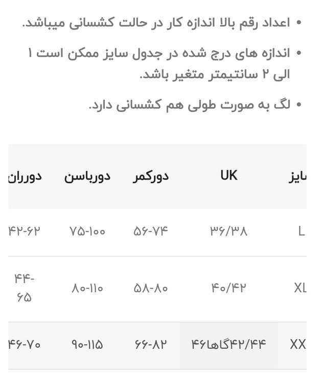 جدول سایزبندی: در اسلاید عکس ها