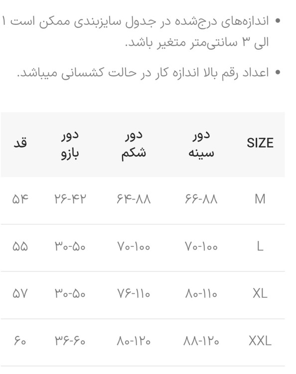 جدول سایزبندی: در اسلاید عکس ها