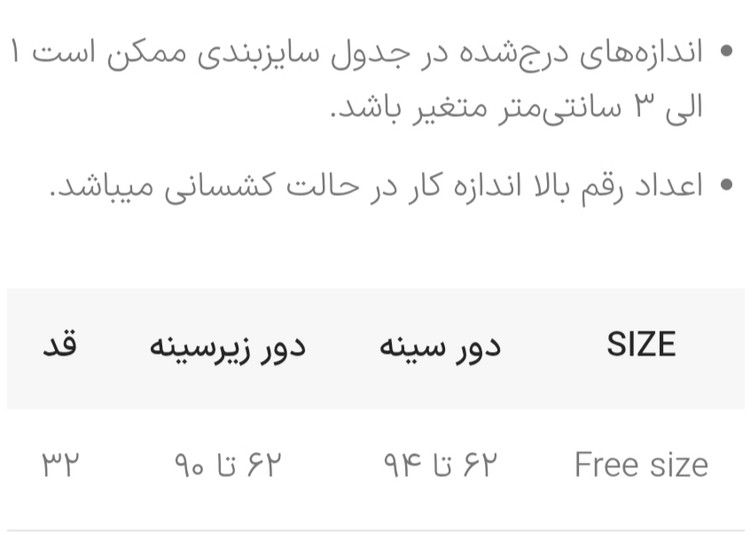 جدول سایزبندی: در اسلاید عکس ها