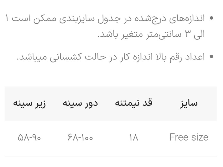 جدول سایزبندی: در اسلاید عکس ها
