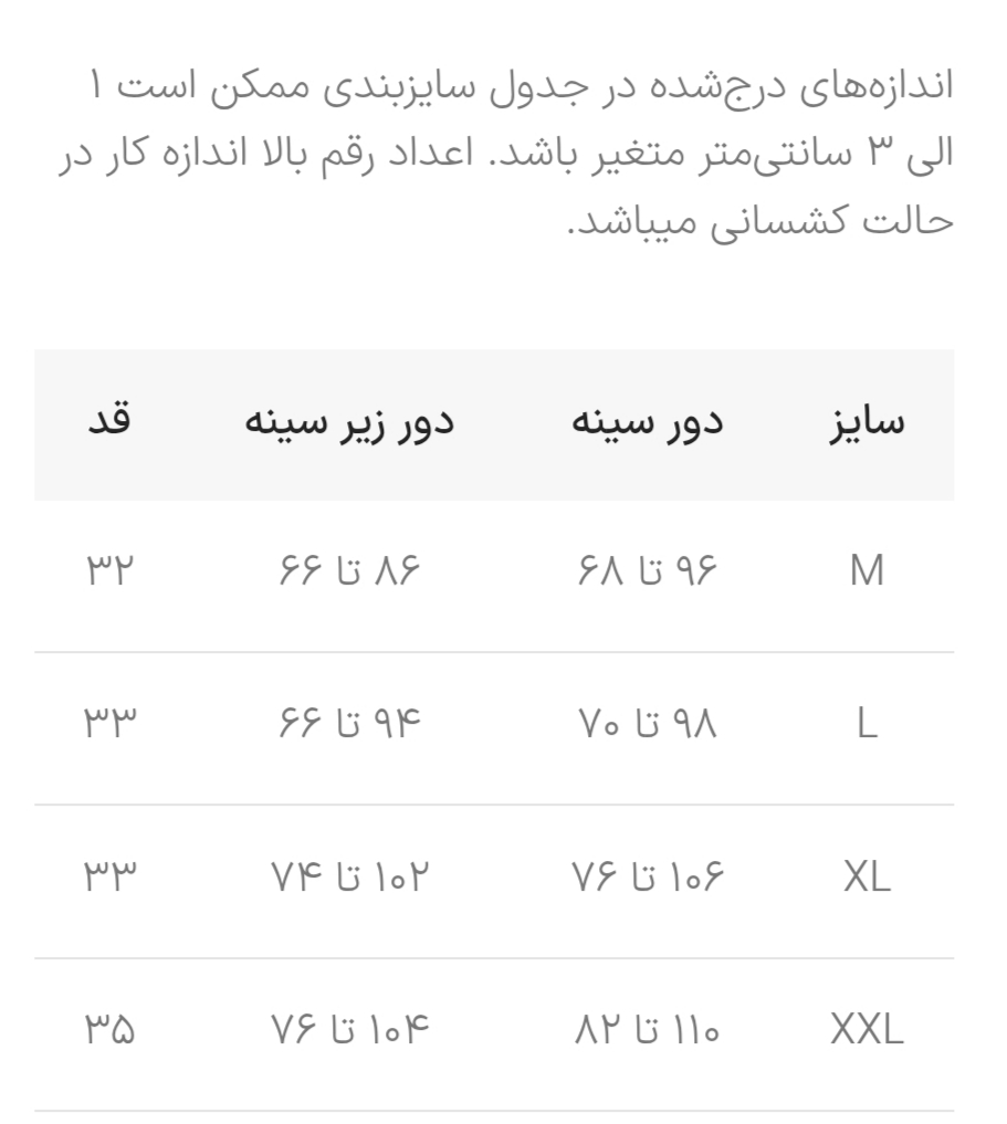 سایزبندی داره جدول سایزبندی در اسلاید عکس ها