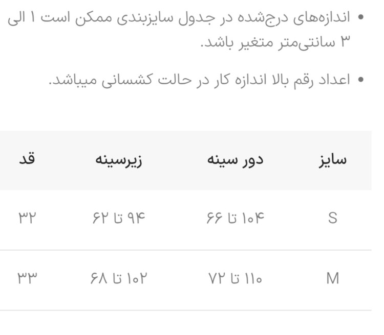 جدول سایزبندی: در اسلاید عکس ها