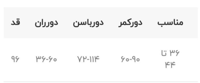 جدول سایزبندی در قسمت اسلاید عکس ها