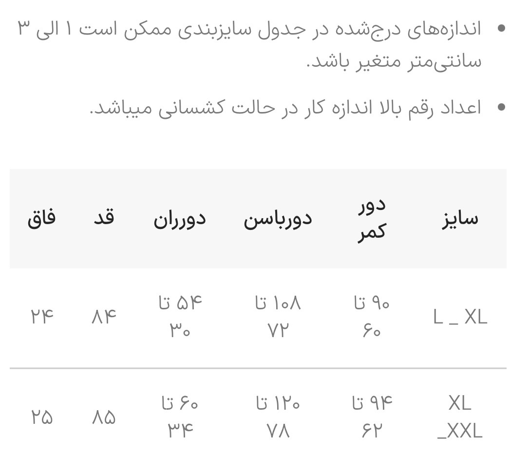 جدول سایزبندی: در قسمت اسلاید عکس ها